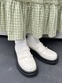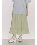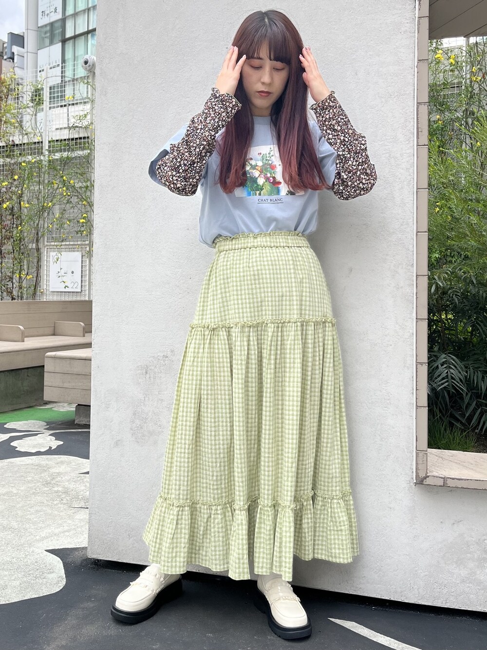 カジュアルガーリーなカラーコーデ。CHAT BLANK Teeのブルーとチェックティアードフレアスカートのグリーンはどちらも明度の高い色味なので相性◎季節感も演出できます!フリルローファーはシンプルだけどフリルのディテールでガーリーさもあり、オールシーズン使える万能シューズです!見た目よりも軽くて歩きやすいのがポイント。