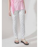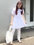 フリルボウタイミニワンピースは一枚でもボウタイとティアードの存在感でガーリーに仕上がりますが、チュニックとしてパンツを合わせてもかわいい!ふわっとしたシルエットなのでタイトめなパンツを合わせて大人ガーリーにしました。パールヒールサンダルはヒール部分にパールが詰め込まれていて後ろ姿もかわいくしてくれます。