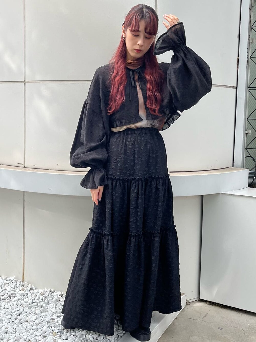 ヴィンテージライクな黒コーデ。スカートは花柄のジャガード素材でシンプルすぎず、唯一無二のデザイン。ティアードでボリュームたっぷりなので、トップスはショート丈ですっきりと。ショートブラウスはボリュームスリーブに手首のギャザーがポイント。柔らかい生地なので着心地も◎。柄の入ったメッシュトップスをインナーにしてコーデのアクセントにしました。