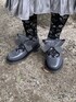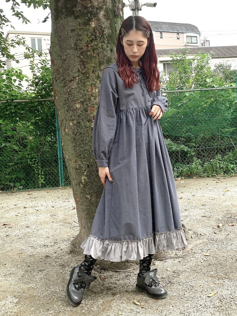 サテンリボンコンビワンピースは、merry jennyの可愛いがたくさん詰まっていてとってもおすすめです!アウターやカーデをレイヤードして、個性を出すのも◎ シルエットが綺麗なのに、着心地がよくて動きやすいです。同系色のauroraリボンラバーシューズを合わせてグレーコーデにしました!