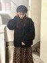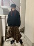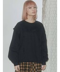 ドッキングフリルトレーナー、シルエットがかなり可愛いです!ダボっとカジュアルで、でも女の子らしさもあって、いいとこ取りです!ギンガムフレアロングスカートのオレンジをアクセントにした黒コーデにしました。リボンスニーカーとの相性も◎