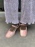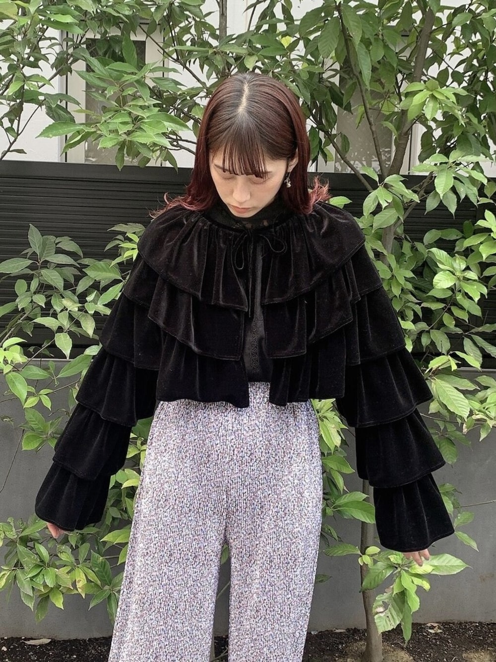 ruffleベロアカーディガンはショート丈なので、ハイウエストのボトムと相性◎なので、今回はパンツと合わせました。ボトムとシューズに色物を持ってくると個性的。floralメロウリラクシーパンツは派手すぎない小花柄なので合わせやすいです!