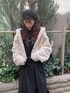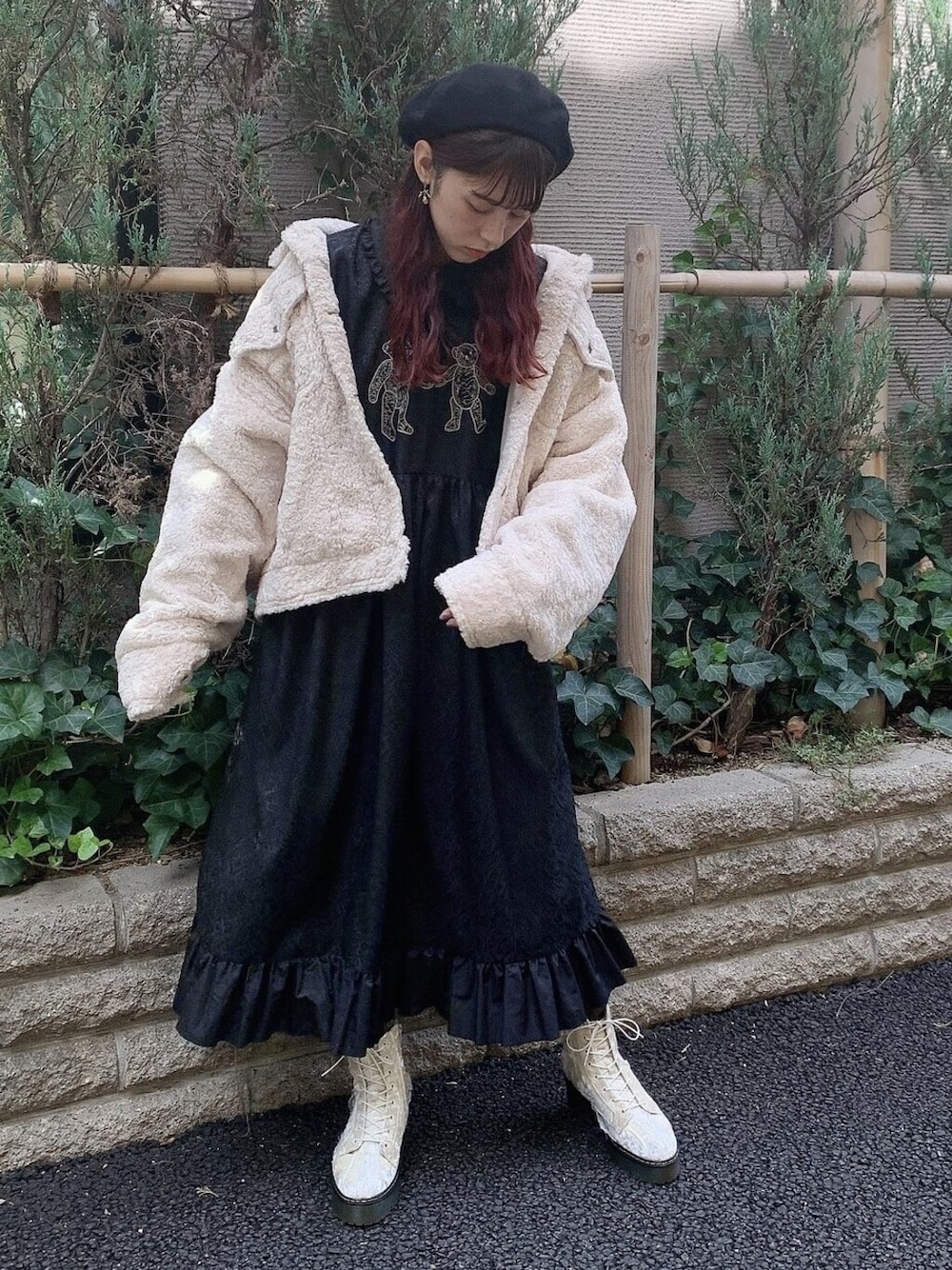 ガーリーなワンピースも、黒を選ぶと甘すぎず、挑戦しやすいです。クマの刺繍がポイントの、ロングbearジャガードワンピースを使ったモノクロコーデ。ワンピースは軽い着心地でさらっとした素材なので、エコファーのアウターとベロアのブーツで季節感を出しています。