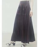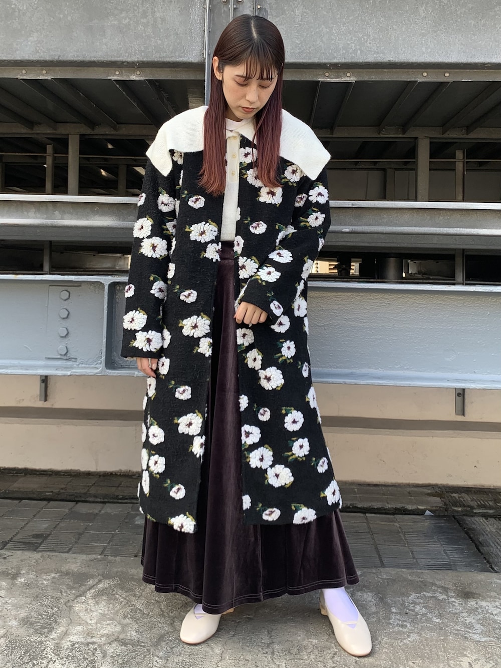 fluffy pattern coatのブラックとベロアハイウエストロングスカートの組み合わせは高身長さんにおすすめです!縦のラインを強調することでスタイルアップ効果◎ モヘアルージーニットの襟を出して着ることでガーリーさも取り入れました。足元はすっきりと明るい色でコンパクトなシューズで合わせました。