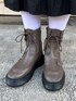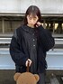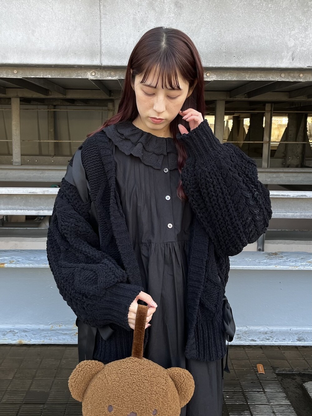 ガーリーなブラックコーデ。Wレースカラーワンピースは、ウエストのギャザーが高めなのでカーディガンやアウターは前を開けて着るのがおすすめ。バッグとブーツはブラウンでまとめました。flower lace upブーツはシンプルながら靴紐にさりげなくお花がついていて、他と差をつけられるアイテムです。