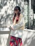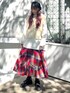 レトロでカジュアルなガーリーコーデ。スカートは裾のデザインがかわいくて、鮮やかな色味なのでコーデのアクセントにぴったりです!トップスはベーシックな色味でまとめました。ニットベストはショート丈ですが厚手でボリュームがあるので、インナーもオーバーサイズを選ぶとバランス◎厚底のシューズは足首が細見えするのでとってもおすすめです!