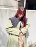 コートはノーカラーなので、襟付きのブラウスの襟を出して着ると個性的でガーリーに。merry jennyらしい着こなしになります!コート自体はシンプルで合わせやすいデザインなので、デイリーユースにぴったりです。グリーンは白が混ざったピスタチオカラーなので優しい印象で、様々なテイストに合う色味になっております。