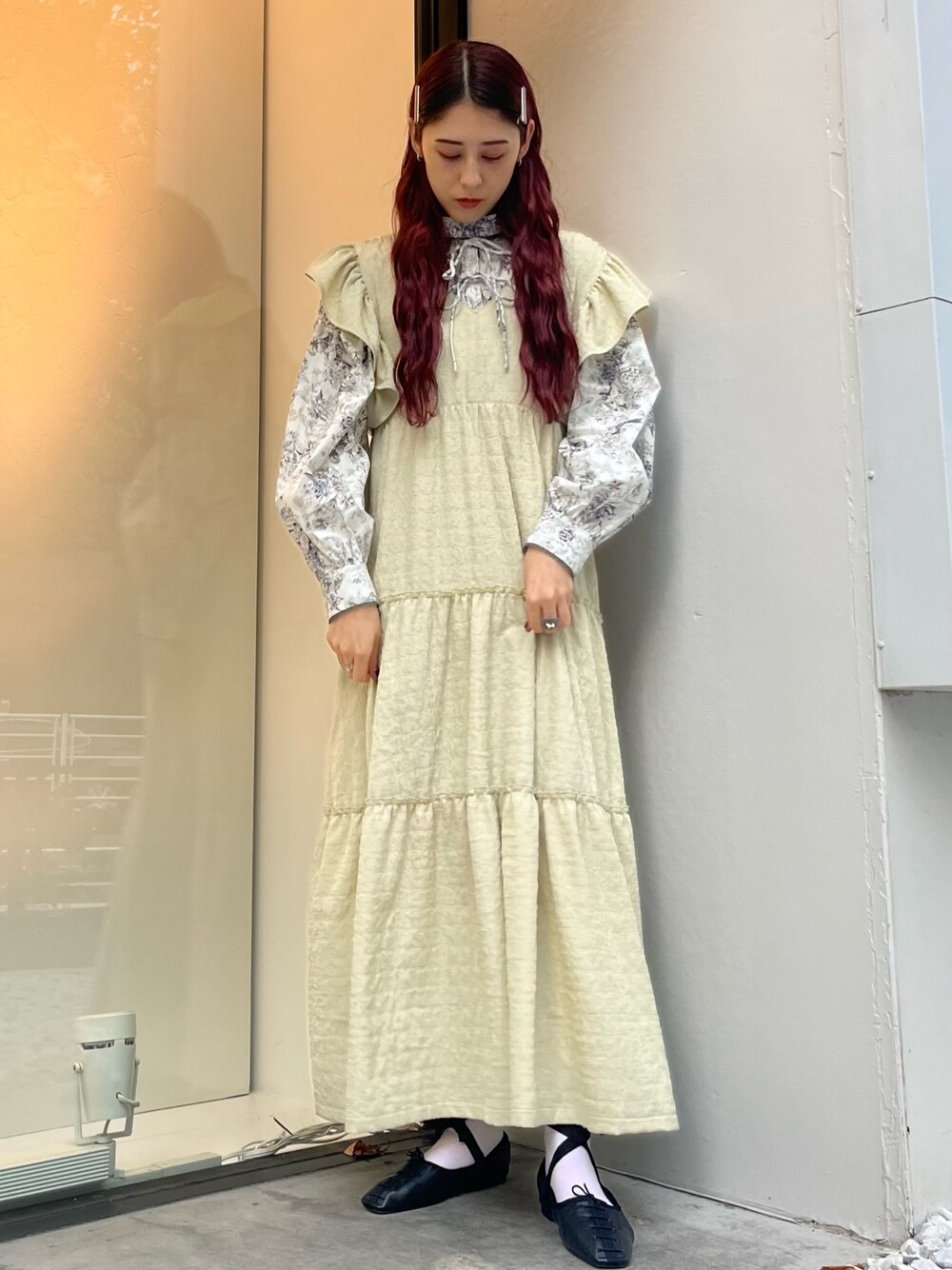 人気のレースアップティアードワンピースに新色が登場!春らしいグリーン×柄ブラウスで涼しげなコーディネートにしました。ウエストの切り替えが高い位置にあるので、スタイルアップ効果抜群◎インナーを変えて長く使えます。