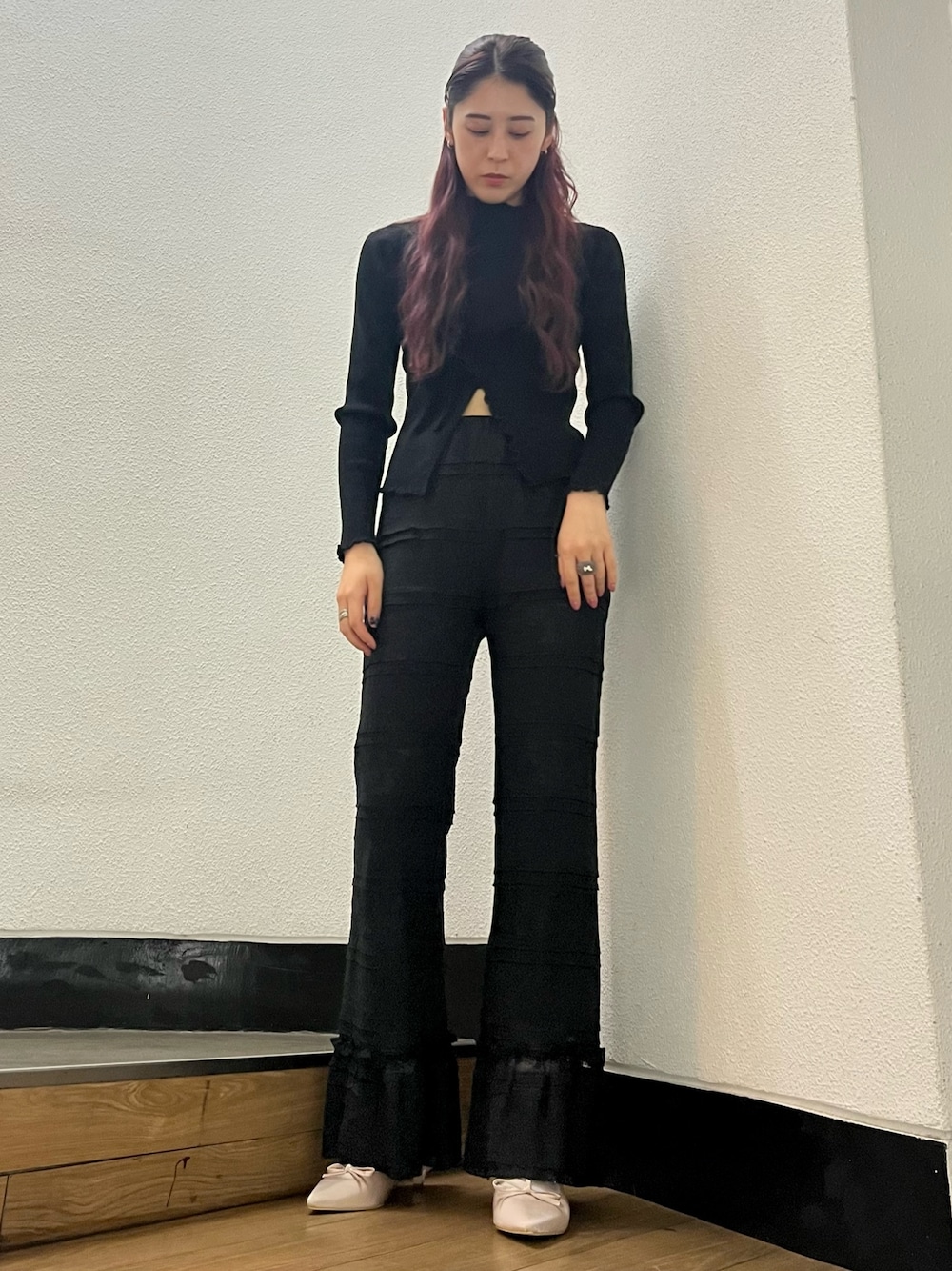大人ガーリーな黒コーデ。 シルエットはタイトながらリボンやレースで甘さをプラスしました。トップスは柔らかくて着やすいです!アシンメトリーなデザインになっているので一枚でもシンプルすぎない◎パンプスはローヒールで見た目以上に歩きやすいです!