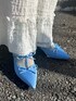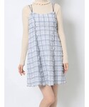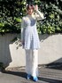 水色×白の大人ガーリーコーデ。ミニワンピースはパンツにレイヤードしてチュニック風にも着ていただけます!インナーに使用しているニットは一枚でもシンプルすぎないディテールながら、ぴたっとしたシルエットなのでレイヤードにも◎