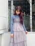 ブルー×グレーの大人ガーリーコーデ。ニットのブルーは深めの落ち着いた色味なので甘くならず着られます。ワンピースはロング丈なので高身長さんにおすすめ◎軽やかな素材感なので涼しげで、パンプスとも相性◎