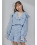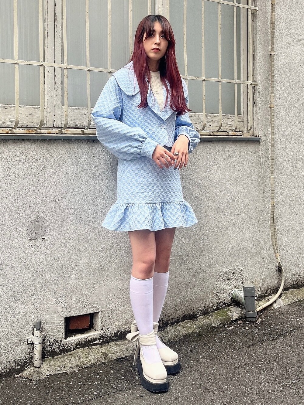 華やかなお花ジャガードのセットアップ。ジャケットはショート丈なのでスタイルアップ効果◎スカートは裾がフリルになっていてさりげなく太ももをカバーしてくれます。厚底シューズとの相性◎
