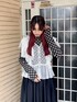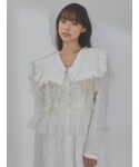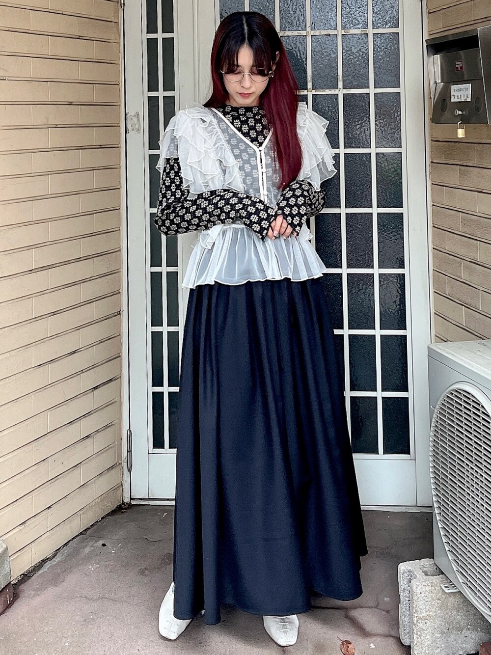 チュールブラウスはビスチェやベストの様にレイヤードすることで華やかさを演出できます!トップスとボトムを黒でまとめたので、ブラウスをアイボリーにし、重たく見えないようにしました。トップスもベージュの花柄がアクセントになってくれるのでシンプルなコーデにおすすめです!