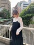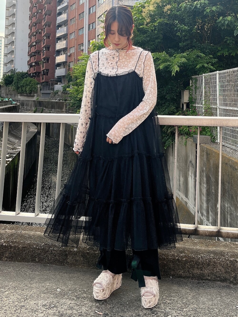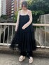 チュールのキャミワンピースはすっきりとした丈感なので、高身長さんはレイヤードワンピースとしてパンツ合わせもおすすめです!ワンピースとパンツをブラックでまとめて大人っぽく仕上げました。ふわっとしたシルエットなのでインナーはすっきりしたものを合わせてバランスをとりました。