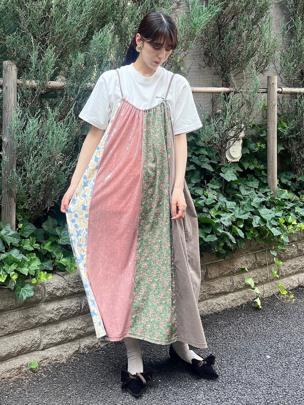 レイヤードワンピースは、ゆったりとしたサイズ感なのでインナーにオーバーサイズのTシャツやスウェットなども着られます◎お花柄とベロア生地が華やかで唯一無二なデザイン!インナーを変えて長く着られるのもうれしいポイントです。