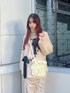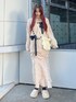 全体を淡色でまとめたコーデは、ニットの黒リボンがアクセントに。ガーリーなデザインのニットに大人っぽいシルエットのスカートを合わせて甘くなりすぎないようにしました。厚底のストラップシューズは、スタイルアップ効果もあり、軽くて歩きやすいアイテムです◎
