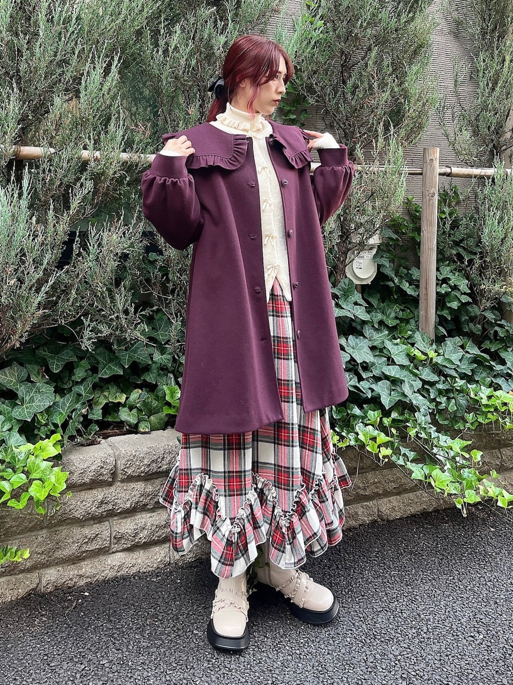 毎年人気のAラインコートにボルドー カラーが登場!深みのあるカラーなので甘すぎず、ヴィンテージライクに仕上がります!中にニットを着込んでも着膨れしないオーバーサイズで、裏地もキルティングなのであたたかいです◎コートが単色なので、スカートに柄を使ってアクセントにしました。