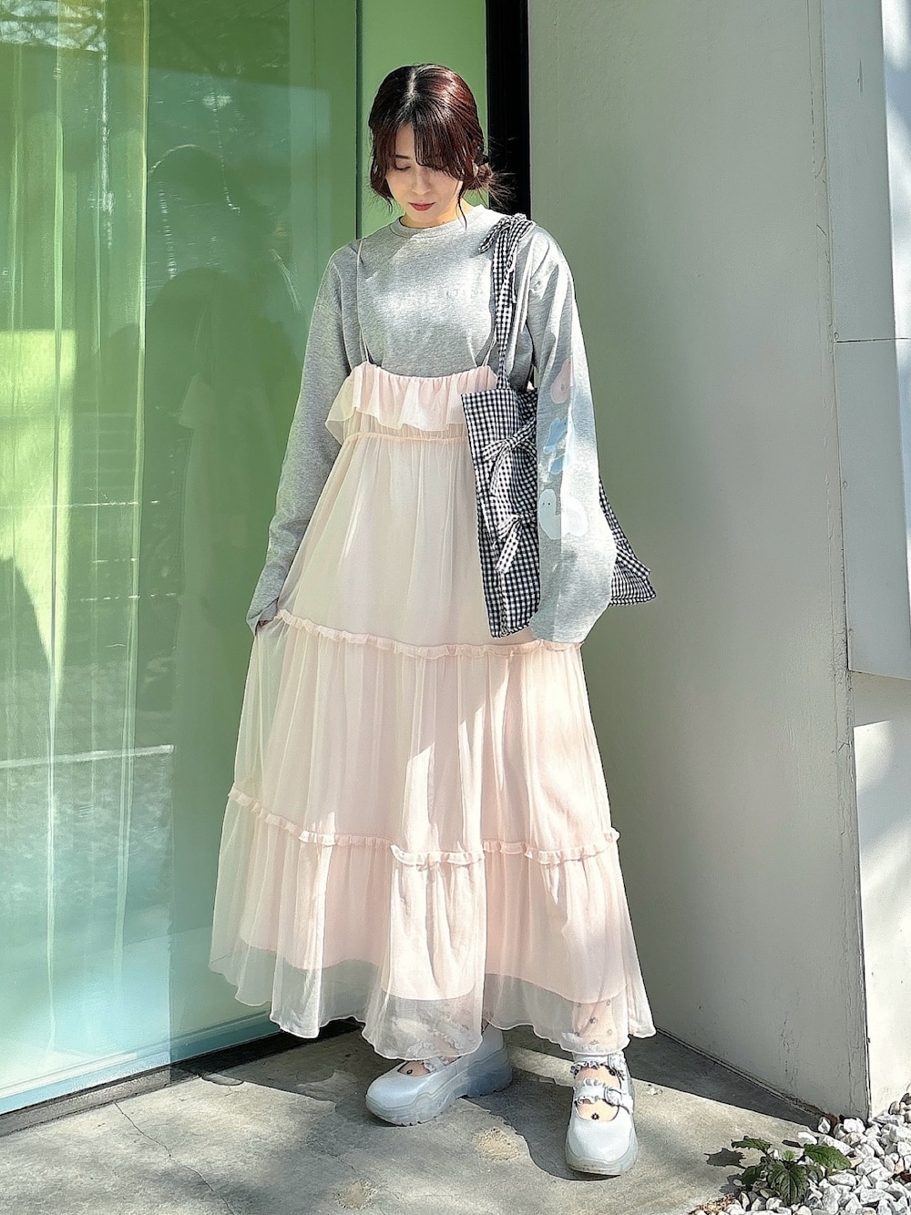 キャミワンピースは、繊細なふわっとした素材とさりげなくキラッとするラメのデザインで、シンプルすぎずコーデを春らしくしてくれます。肩紐で長さも調節可能なので、高身長さんはストラップスカートとして、Tシャツのロゴやプリントが見えるように着る着方もおすすめです◎