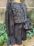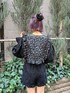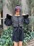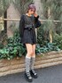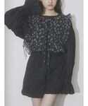 ミニ丈のオールインワンは、立体的なお花が華やかで、一枚でもシンプルになりすぎずおしゃれに。首周りがすっきりしているのでフリルと柄のつけ襟を合わせてアクセントにしました!つけ襟は大きめで、ベストのようにレイヤードできるアイテムなので、いつものトップスに合わせるだけでコーデの幅が広がります!