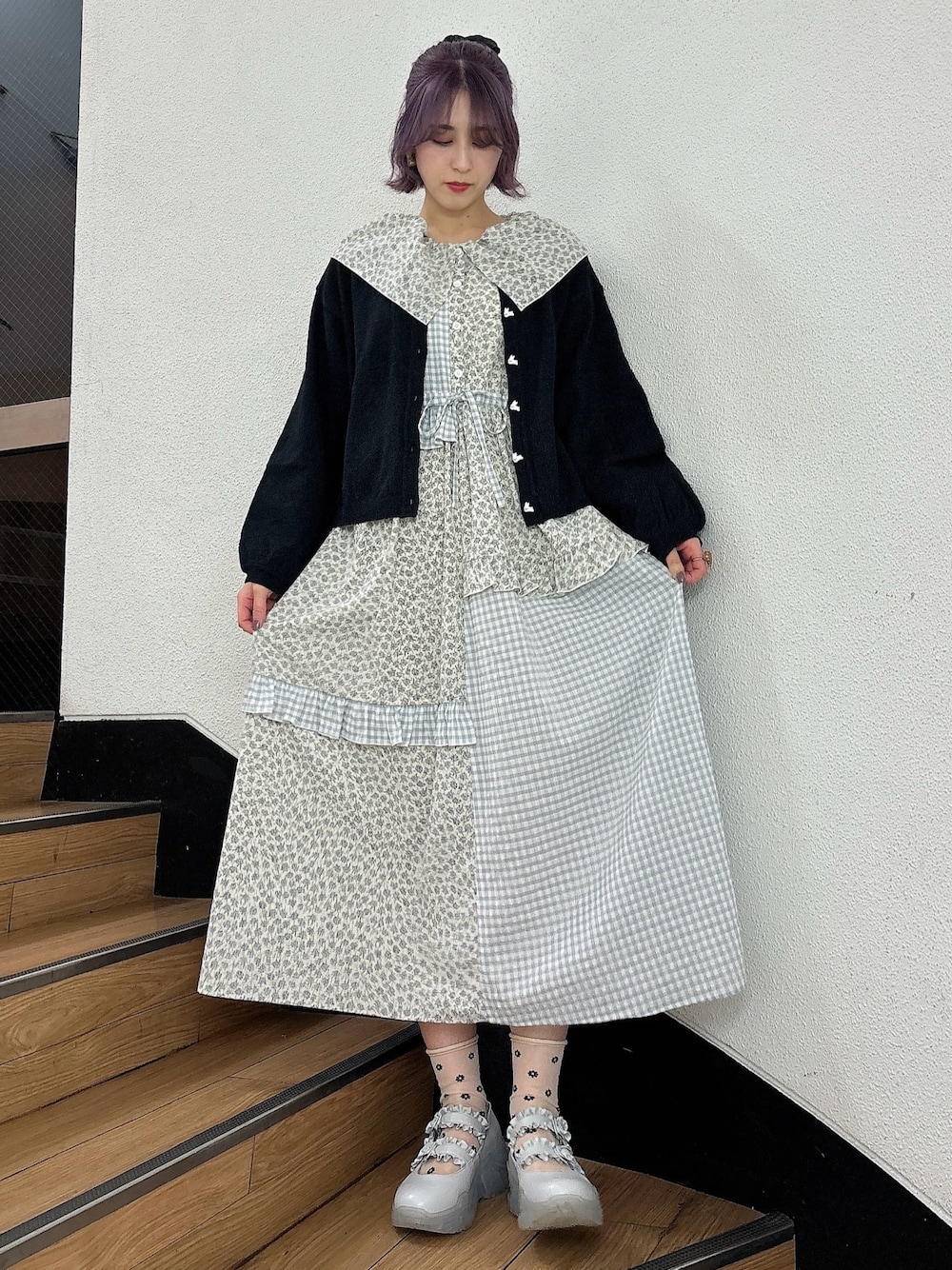 ギンガムチェックと花柄がつぎはぎになったワンピースは、総柄なので一枚でも華やかさ◎薄手の生地なのでカーディガンなどで温度調節とレイヤードがしやすく、着回しも楽しめます!カーディガンは、もちっとした生地で落ち感があるので、ヴィンテージ感があり、甘すぎず様々な系統に合わせていただけます!うさぎのボタンがポイント◎