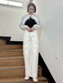 大人ガーリーなパンツスタイル 【トップス】 チュールのフリルがポイントのトップスは一枚でも肌見せと華やかさが同時にかなうアイテム。 【カーディガン】 ショート丈のカーディガンは袖がふわっとしているので二の腕をカバーしてくれつつ、透け感があるので涼しげに見せてくれます!夏の日除けにもおすすめ。 【パンツ】 お花柄とレースのデザインなので、カジュアルになりすぎず、ガーリーさんにもおすすめ。163cmで丈がちょうど良かったので、低身長さんで丈が長く感じる方は裾をロールアップして履いていただくこともできます! 【シューズ】 トレンドのバレエシューズは、柄入りでメリーらしく。落ち着いた色味なので、大人っぽいコーデに相性◎