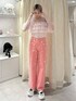 抜け感のある大人ガーリーなピンクコーデ 【トップス】 ふわっとしたティアードのディテールが唯一無二なトップスは、デコルテから腕部分にかけて透け感のあるデザインで、重たく見えず、程よく肌見せができます。 【パンツ】 ちいさいリボンがかわいいデニムは、ウエストの後ろがゴムになっていて履き心地◎ ストレートのシルエットで、様々な骨格の方に合いやすくなっています。 【シューズ】 軽くて歩きやすい厚底シューズ!甲の部分のレースデザインやテープ部分のリボンがトレンド感◎ 足元まで抜かりなくおしゃれ感を演出してくれます!