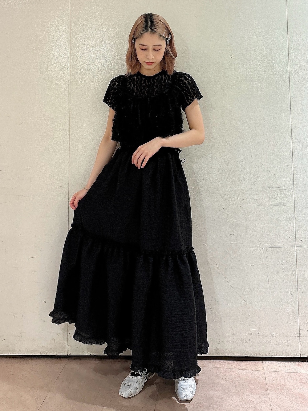 ドッキングフレアワンピースブラックのおすすめコーデ 【ワンピース】 レースのカットトップスとフレアスカートが一体になっていて、ウエストのサイドにあるリボンでウエストマークが可能です◎ スカートに光沢感があり、オケージョンや大人っぽいアイテムがお好きな方にもおすすめです! 【ビスチェ】 きらきらとリボンが夏らしいビスチェは、ショート丈なので様々なコーデに取り入れやすいです◎ 肩紐の長さも調節可能です! 【シューズ】 トレンドのバレエシューズがメリーらしい柄で登場!リボンの部分はゴムになっているので着脱も楽ちん。 靴下合わせでオールシーズン着用できます◎ 24.0cmでLがちょうどよかったです!