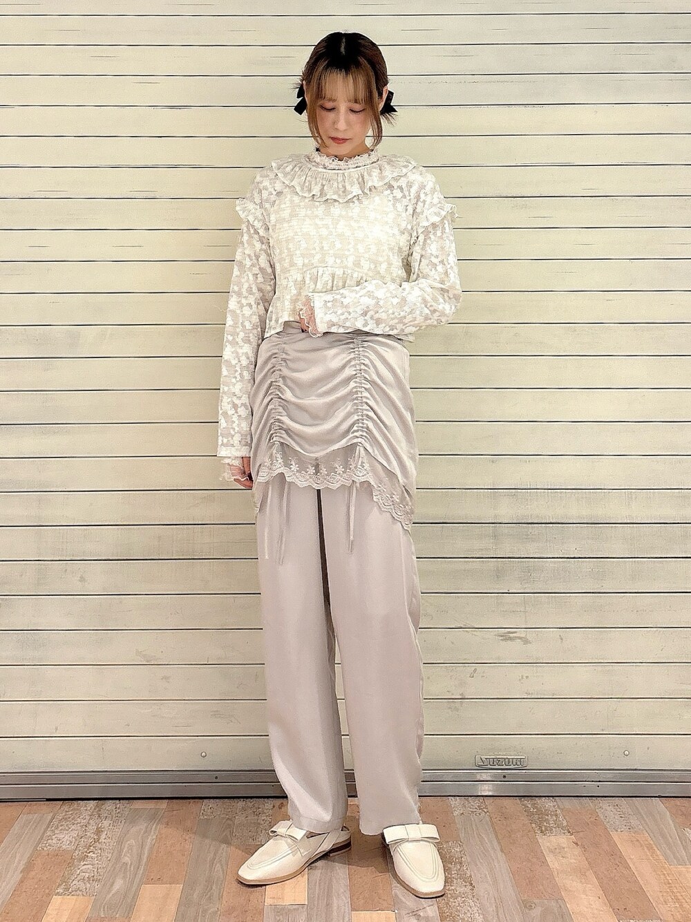 nanaka(merry jenny)のスラックス「サテンレイヤードパンツ」を使ったコーディネート