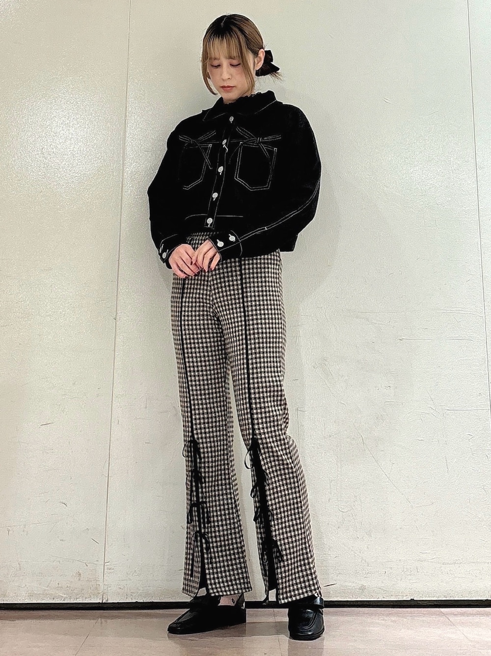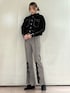 カジュアルガーリーなパンツコーデ 【ジャケット】 ポケットのリボンがトレンド感のあるデニムジャケット。ショート丈なのでスタイルアップ効果◎袖と身幅はゆったりめなのでレイヤードもしやすいアイテムです。 【トップス】 レースとフリルが華やかなトップスは、透け感があるので暑いうちから取り入れやすいアイテム◎カーディガンやキャミワンピのインナーにおすすめです! 【パンツ】 柔らかく伸びのいい生地で履きやすい!リボンのついたスリットデザインなので裾だけ覗かせてもかわいいです。丈が他のパンツよりもすっきりめなので低身長の方にもおすすめ。 【シューズ】 フラットシューズなので歩きやすく、つま先のスクエアが大人っぽいアイテム。きれいめコーデにもガーリーコーデにも合わせやすいです◎ 24.0cmでLを着用しております。