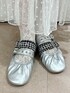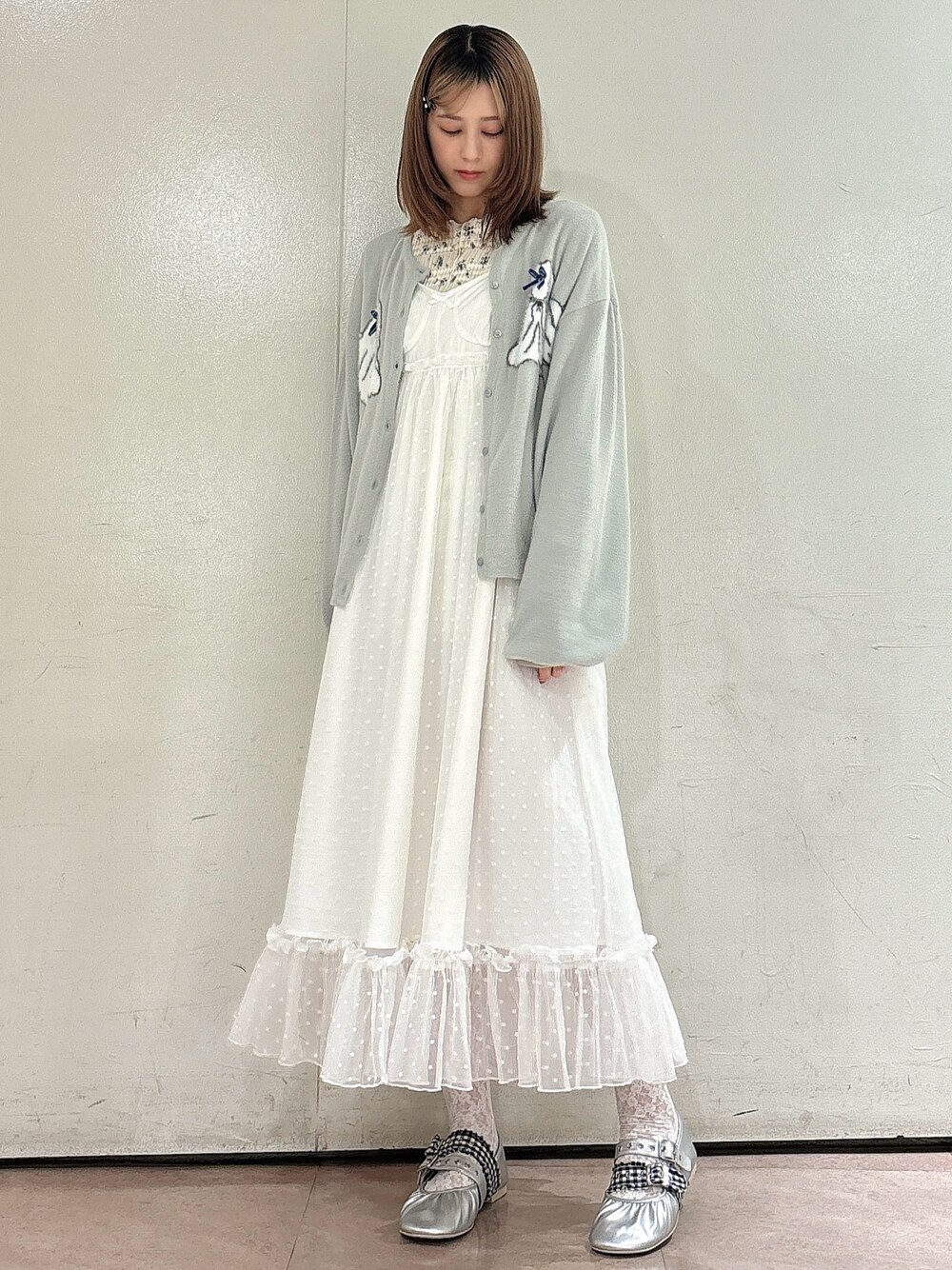 白×グレーのカジュアルガーリーコーデ 【トップス(上)】 ゆるいタッチのシーズーとリボンがポイントのカーデはもちっとした素材感で肌触りも◎落ち間のあるシルエットなので着膨れしにくいのが嬉しい一枚! 【トップス(下)】 くしゅっとした素材感がかわいいトップスは、首が詰まりすぎていないのでどんな骨格の方にも着ていただきやすいです!袖口にはベロアリボンもついていて、華やかさも◎ 【ワンピース】 コルセットのデザインがトレンドのバレエコアのような雰囲気のワンピースは、切り替えが高めの位置に設定されているので脚長効果◎チュールのドット柄はお花型になっています! 【シューズ】 丸いつま先とアシンメトリーになったバンドがアクセントになるアイテム。生地が柔らかく足に合わせて馴染んでくれるので、幅広さんにも合いやすいです。24.0cmでLサイズを着用しております。