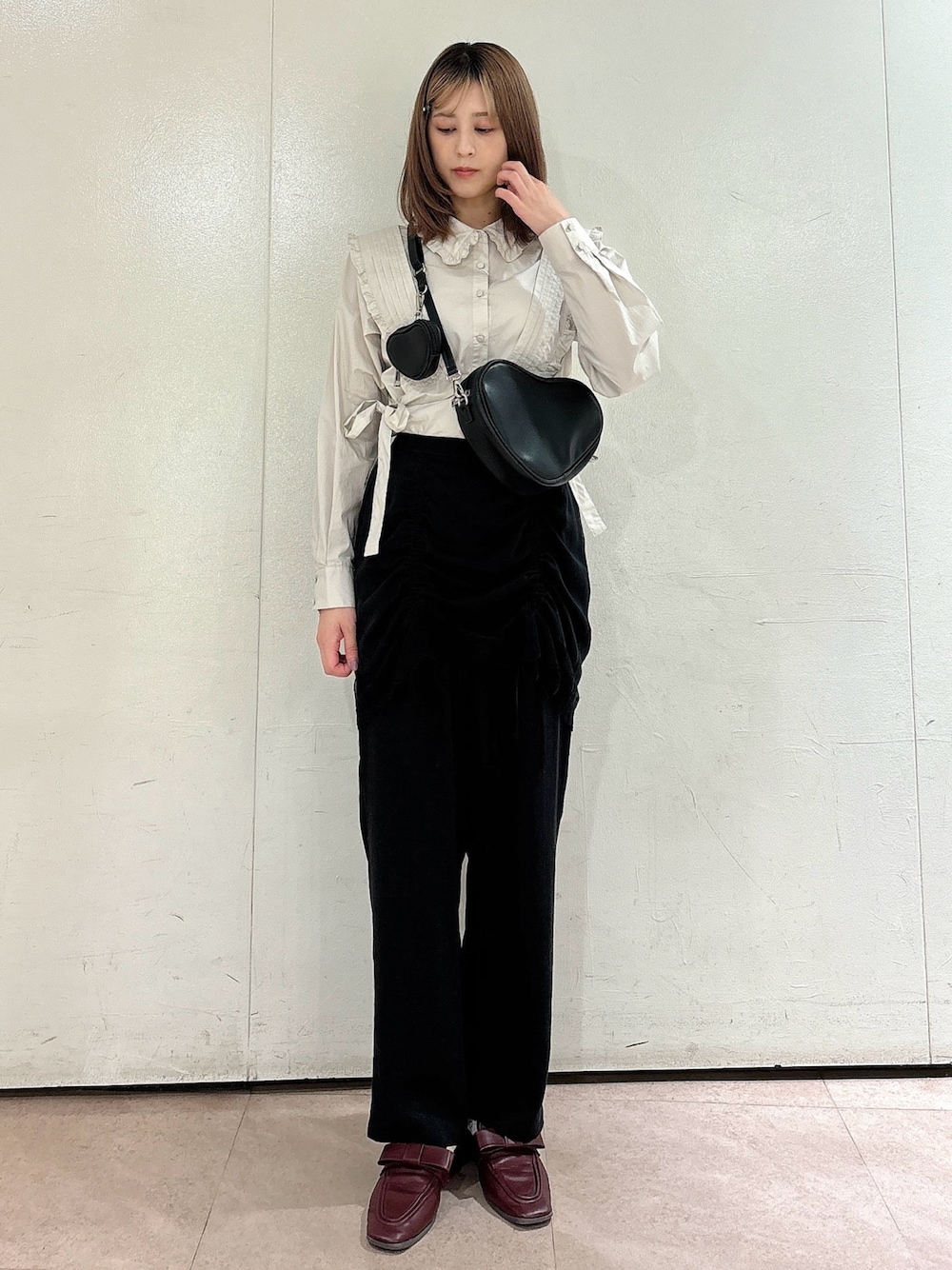 きれいめガーリーコーデ 【トップス】 ハーネスとブラウスがセットになっていて、別々でも着回せます!ブラウスは小さめの襟なので大人っぽくも着ていただけます! 【パンツ】 トレンド感のあるスカートパンツ。サテン生地とドロストが大人っぽくも着ていただけます!軽い生地なので着心地も◎ 【シューズ】 フラットシューズなので歩きやすく、つま先のスクエアが大人っぽいアイテム。きれいめコーデにもガーリーコーデにも合わせやすいです◎ 24.0cmでLを着用しております。 【バッグ】 2つのハートがコーデをよりかわいくしてくれるアイテム。実用性も高く、見た目以上の大容量です◎