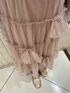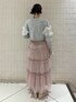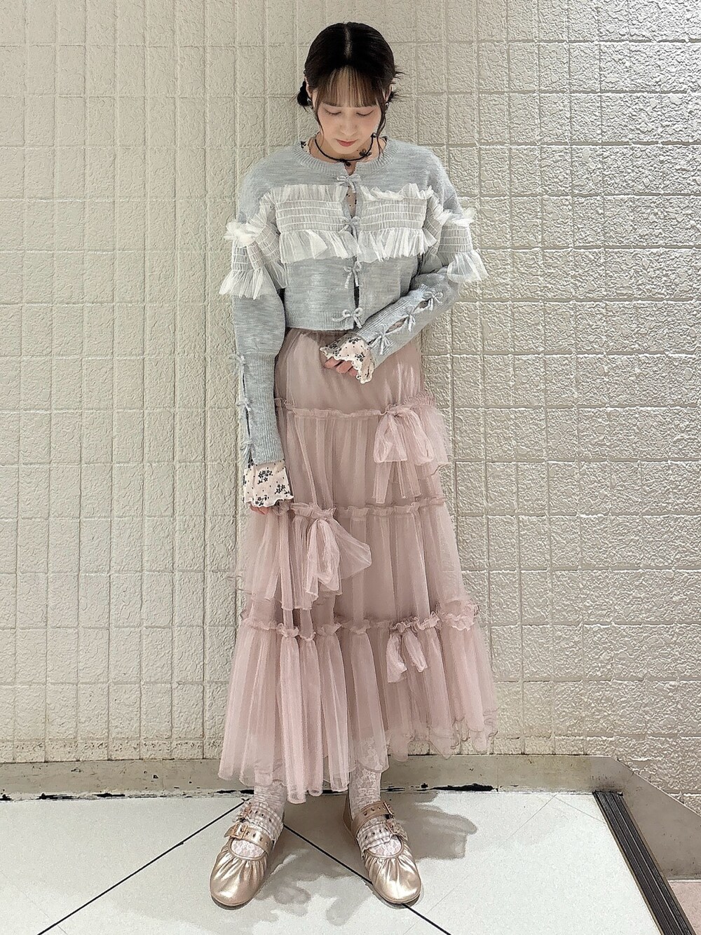 チュール素材のレイヤードコーデ 【トップス(上)】 たくさんのリボンとチュールのフリルがポイントのカーディガン。ショート丈と袖のリブでシルエットもメリハリをつけられます◎前開きなのでジャケット感覚で使えます! 【トップス(下)】 シアー、ドロスト、フレアスリーブとトレンド感のあるポイントがたくさんのトップス。アイボリーは生地に色がついているので透けすぎず、安心感も◎ 薄手なのでレイヤードにもおすすめです! 【スカート】 ふわっとしたフレアシルエットと大きいリボンがポイント。ウエストはゴムで軽い素材なので着心地も良く、どんなトップスにも合わせやすい一枚。 【シューズ】 丸いつま先とアシンメトリーになったバンドがアクセントになるアイテム。生地が柔らかく足に合わせて馴染んでくれるので、幅広さんにも合いやすいです。24.0cmでLサイズを着用しております。