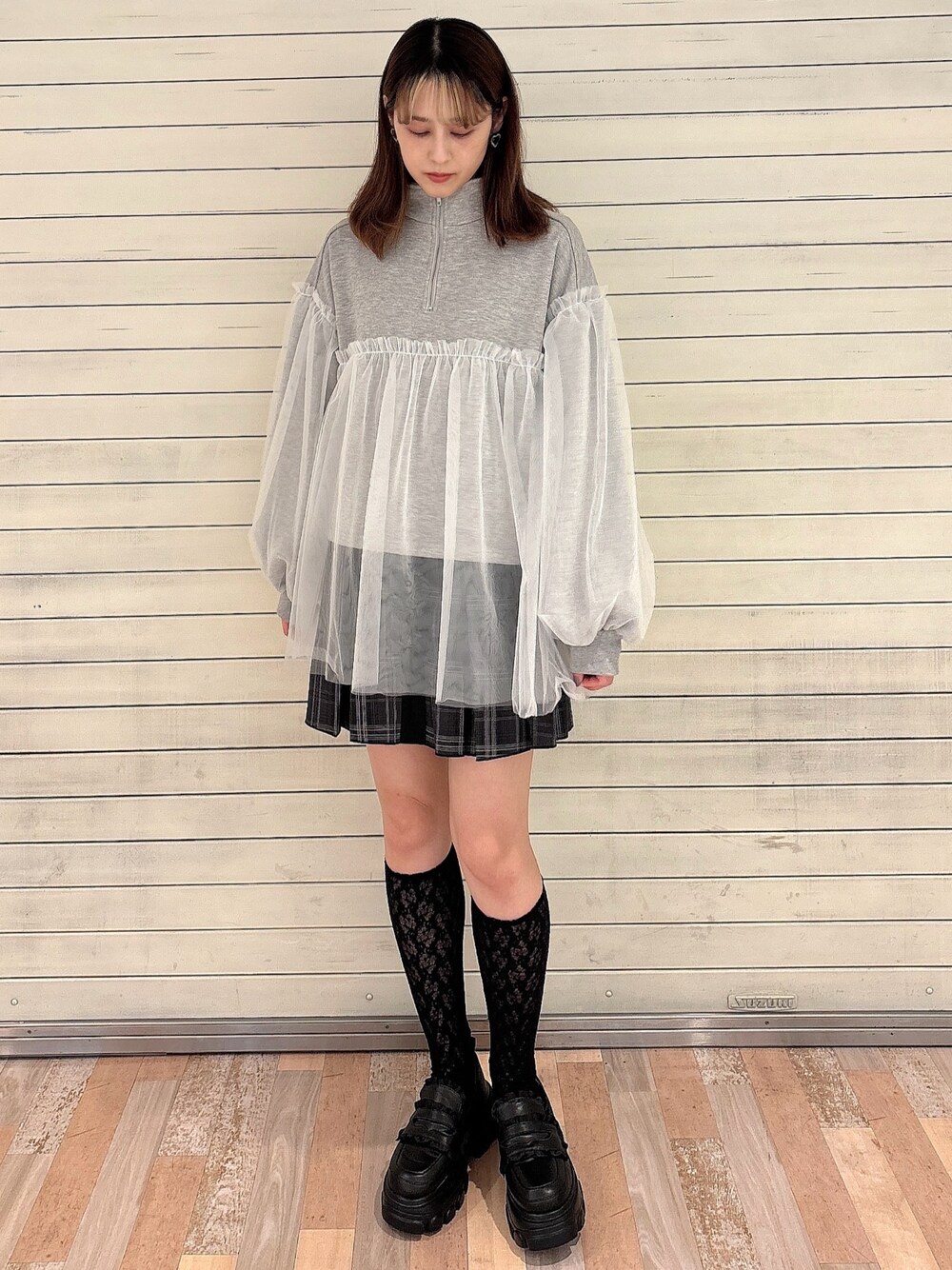 トレンドコーデ 【トップス】 トレンドのハーフZIPとチュールのスウェットは、ふわっとした袖がガーリー。ミニスカートやパンツなどレイヤードが楽しめるアイテム。 【スカート】 丈感とプリーツのデザインが絶妙で、美脚効果の高いミニスカート。たくさんのリボンもポイントで、合わせやすい色味ながらシンプルなトップスのアクセントにも。 【シューズ】 合皮ではなく中綿入りのぷくっとした生地が珍しいローファー。底は8cm以上とかなり厚底ですが軽くて歩きやすく、脚長効果も◎ 24.0cmだとMは小さく、Lだと少し大きかったので、Lで中敷等入れて調節することをおすすめします!