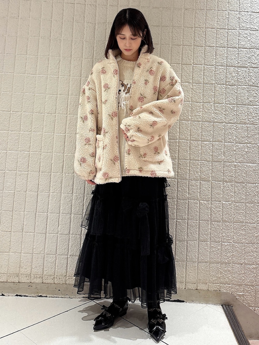 nanaka(merry jenny)のブルゾン「flowerボアブルゾン / 花柄ボアブルゾン」を使ったコーディネート