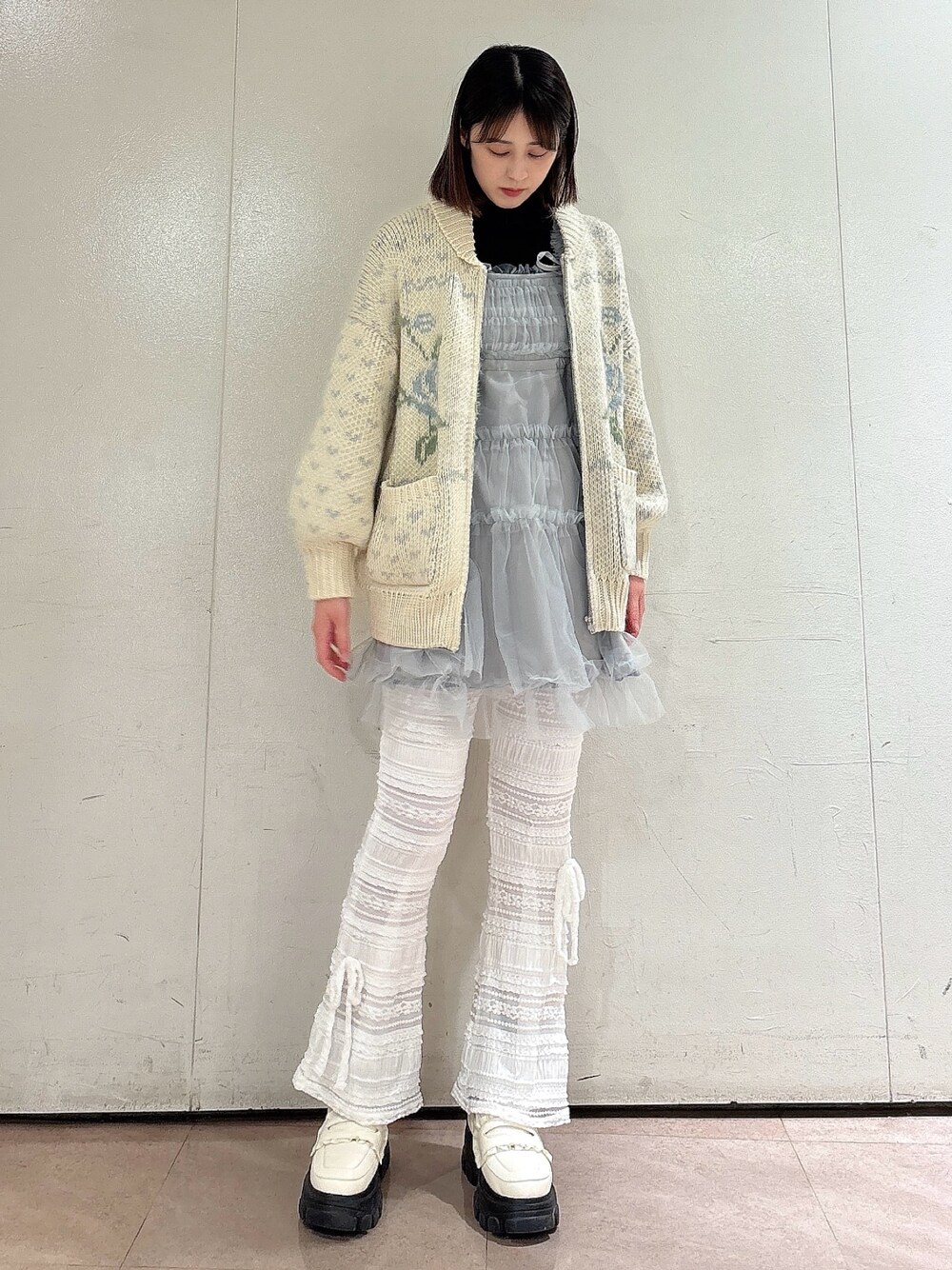 【カーディガン】 肉厚でアウターとしても使えるニットカーディガン。ジッパータイプなので着脱もしやすく、オーバーサイズなので重ね着できあたたかく着られます◎ 【トップス】 首元がフリルになっているタートルニットはキャミワンピやカーディガンなどとのレイヤードにとってもおすすめ◎柔らかく伸縮性が高いので着心地も窮屈に感じず着やすいです! 【ワンピース】 たっぷりのチュールがふわっとかわいいワンピース。ウエストはサイドのリボンで絞っていただけて、丈も長すぎず短すぎずなので幅広い骨格、身長の方に合いやすくなっています◎ 【パンツ】 毎回人気のレースパンツが、リボン付きで再登場!今回は少し丈が長くなり、高身長さんも着ていただきやすくなっています!フレアシルエットが美脚効果◎ 【シューズ】 合皮ではなく中綿入りのぷくっとした生地が珍しいローファー。底は8cm以上とかなり厚底ですが軽くて歩きやすく、脚長効果も◎ 24.0cmだとMは小さく、Lだと少し大きかったので、Lで中敷等入れて調節することをおすすめします!