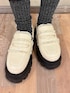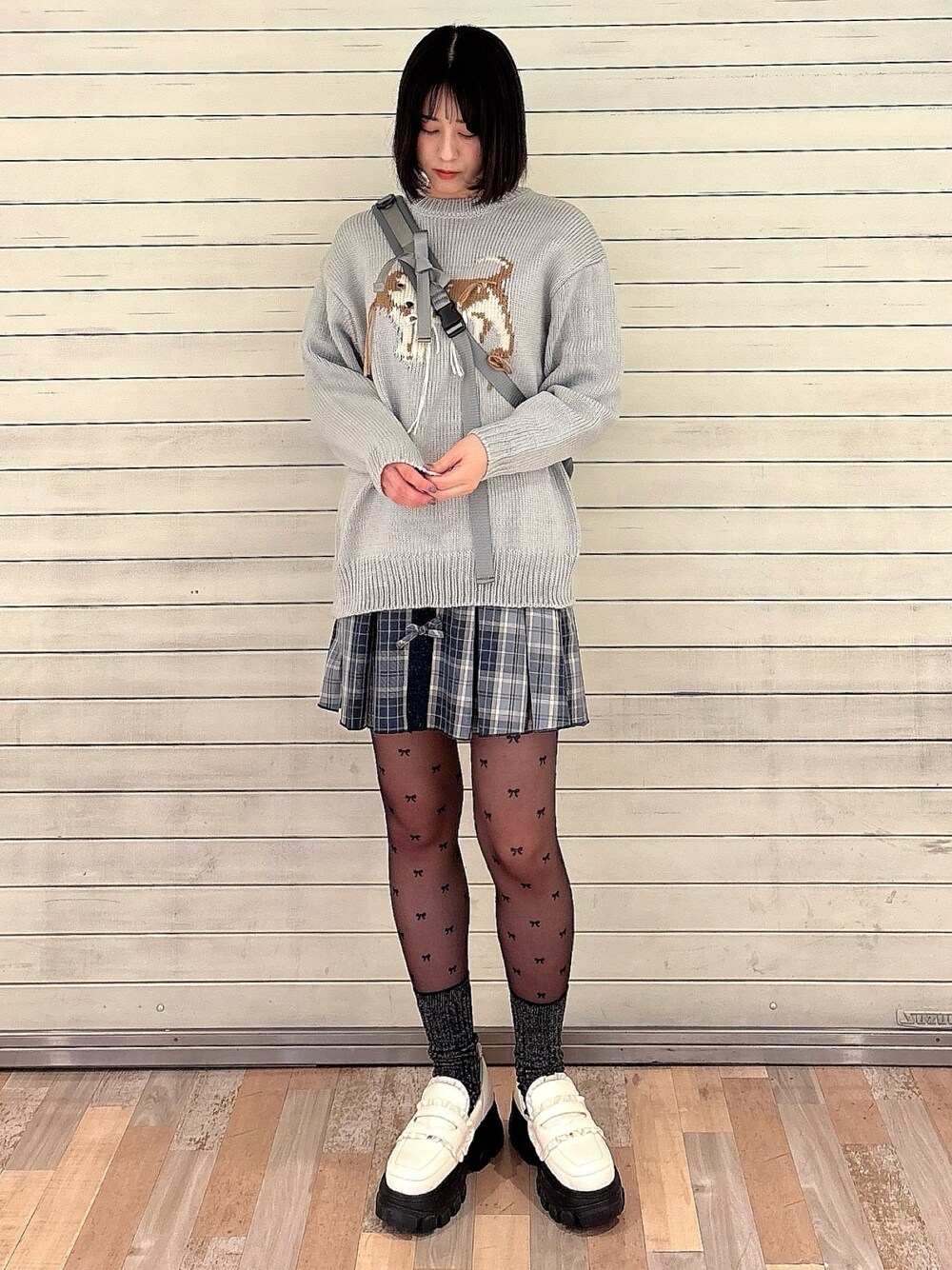 【トップス】 オーバーサイズと犬のデザインがヴィンテージライクなニット。柔らかくて着心地も◎ランダムに付いている毛糸はリボンにしても垂らしても。 【スカート】 丈感とプリーツのデザインが絶妙で、美脚効果の高いミニスカート。たくさんのリボンもポイントで、合わせやすい色味ながらシンプルなトップスのアクセントにも。 【バッグ】 大容量の斜めがけバッグ。カジュアル感のある素材ですがたくさんのリボンがガーリーさも演出してくれます◎ 【シューズ】 合皮ではなく中綿入りのぷくっとした生地が珍しいローファー。底は8cm以上とかなり厚底ですが軽くて歩きやすく、脚長効果も◎ 24.0cmだとMは小さく、Lだと少し大きかったので、Lで中敷等入れて調節することをおすすめします!