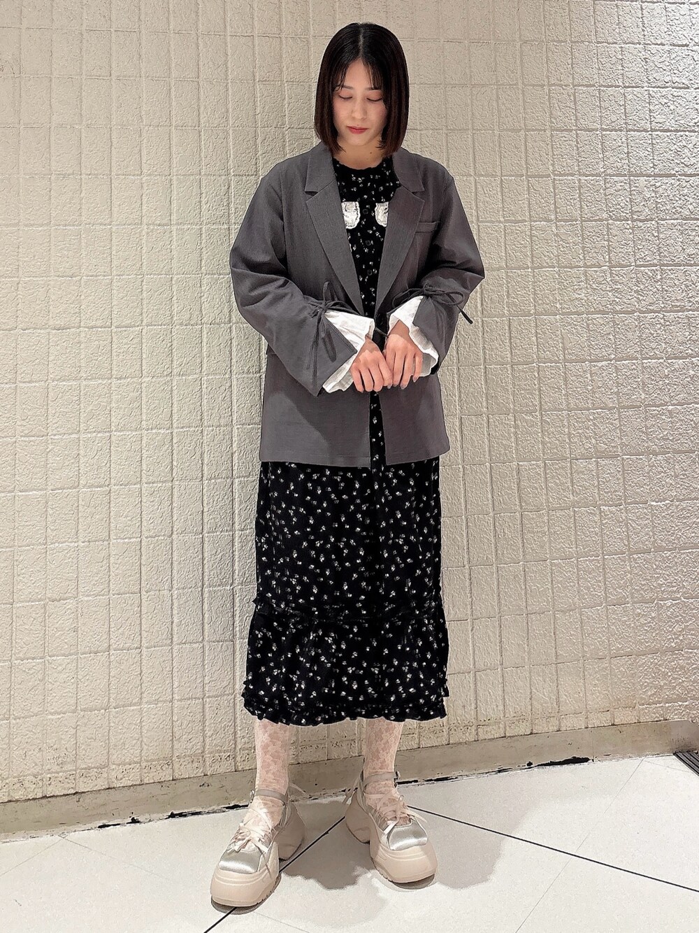 【アウター】 一見シンプルなテーラードジャケットですが、袖元のレースや背面のスリットやリボンなど、さりげないポイントがたくさん! 裏地もしっかりついていて春のアウターとして活躍してくれます◎ 【ワンピース】 花柄とレースのリボンモチーフがポイントのワンピースは、すっきりめの丈と薄手の生地でストンとしたシルエットがとっても綺麗!