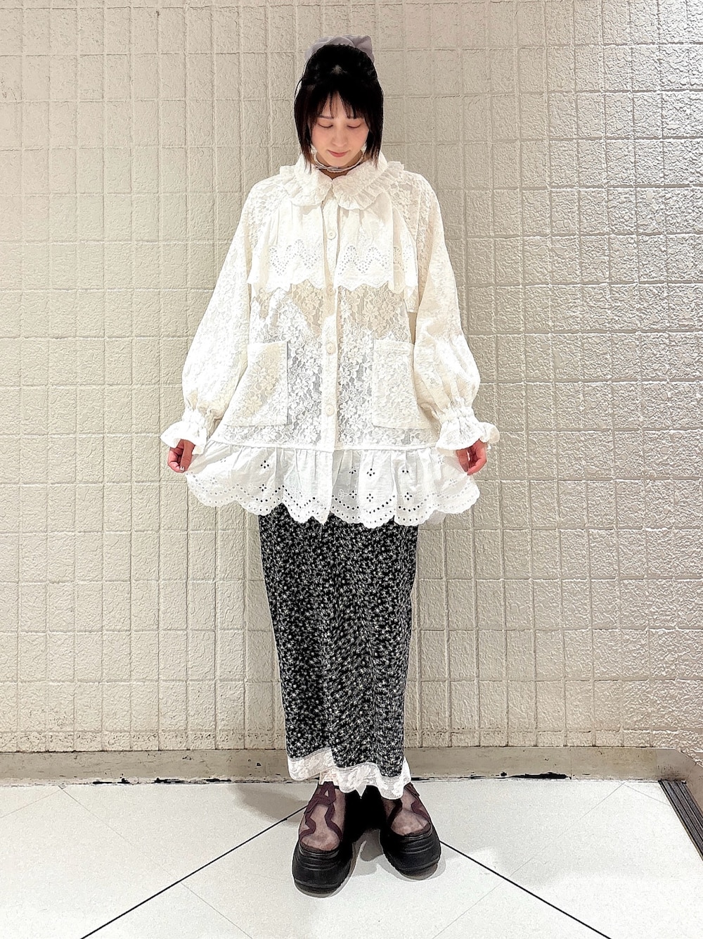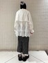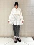 【アウター】 レースたっぷりのジャケットはケープフリルや裾のフリルで華やかさ◎ミニ丈との組み合わせでワンピースとしても着ていただけます!丈が長すぎないので、重たく見えないのがポイント! 【トップス】 すっきりした首元と丈感が大人ガーリーなトップス。ぴったりしすぎたシルエットではないので、体のラインをカバーしつつ綺麗に見せてくれます! 【スカート】 すとんとしたシルエットが大人っぽく、すっきりした印象のスカートは、レースのデザインで華やかさ◎深めのスリットでおしゃれ感も高いです! 【シューズ】 リボンの刺繍がポイントのサボ。厚底ですが軽くて疲れにくいです。甲の部分は透け感があるので靴下との組み合わせも楽しめます◎