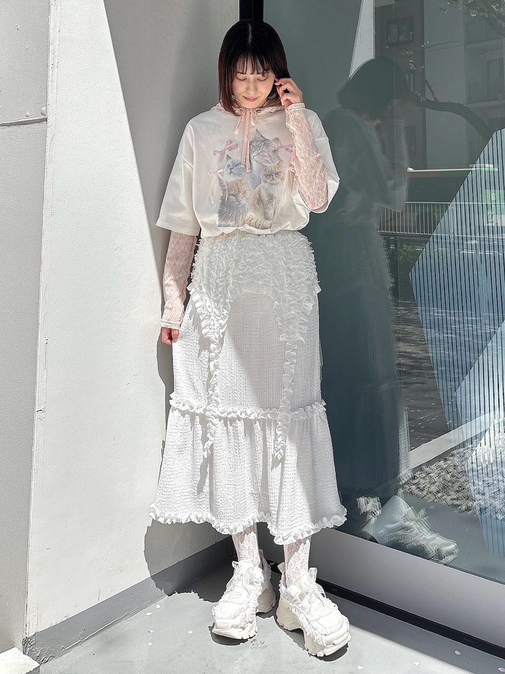 【トップス】 長く垂れたうさ耳がトレンド感◎透け感のあるレース素材なので甘すぎることなくさりげなくガーリーさを取り入れていただけます。 【トップス】 猫とリボンのデザインがかわいいTシャツはミニワンピとしても着られるくらいのオーバーサイズで、甘くなりすぎずカジュアルに着られます! 【スカート】 トレンドのガーターデザインとフラッフィー生地が大人ガーリーなスカート。柔らかくストレッチの効いた素材なので着やすさも◎ 【シューズ】 たっぷりのフリルと丸い形がかわいいスニーカーは、厚底ですが軽くて歩きやすい◎紐が2種類付いていて、好きな方に付け替えられます。