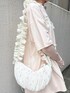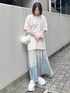 【トップス】 オーバーサイズと柔らかい生地感で着心地◎なTシャツ。デザインも立体感のあるレースやプリントが唯一無二でかわいい! 【トップス】 シンプルで合わせやすく、肌触りもいいので暑いうちから着やすいアイテム◎レイヤードコーデのインナーにおすすめです! 【スカート】 ニュアンス柄が個性的なスカートは、ストンとしたシルエットで広がりすぎず、大人っぽく着られます。ウエストゴムなので着心地◎ 【バッグ】 トレンドのハーフムーンバッグ。小花柄なのでコーデのアクセントにも◎長さ調節もできて実用性も高いアイテムです。 【シューズ】 たっぷりのレースフリルがガーリーなスニーカーは、見た目以上に軽くて歩きやすいです!マジックテープなので着脱も楽!