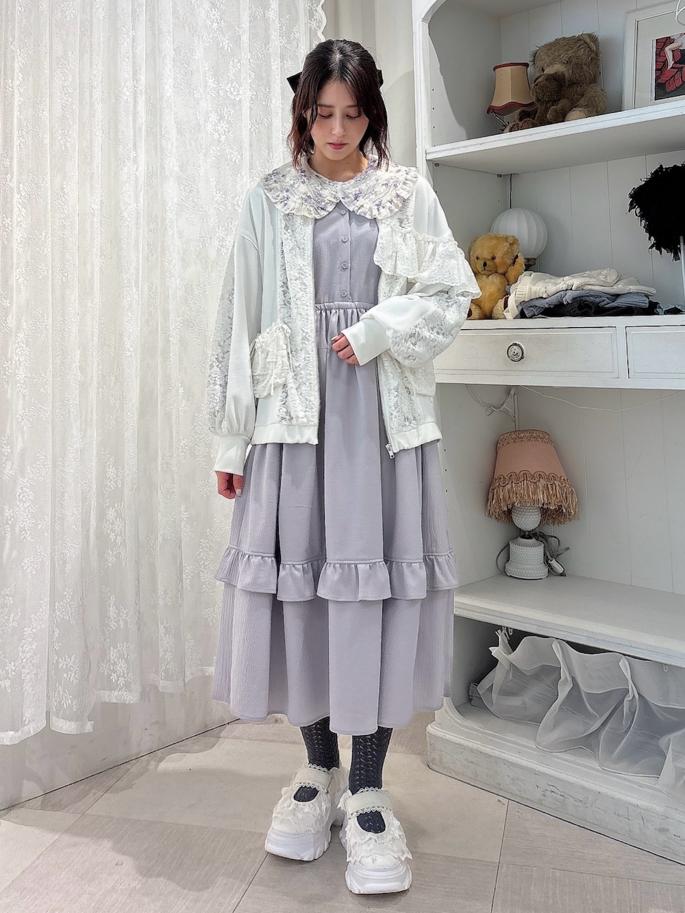 【ジャケット】 ゆるっとしたサイズ感とコットンレースがカジュアルガーリーなトラックジャケット。柔らかい生地感で着心地も◎ 【ワンピース】 さらっとした生地で着心地もよく、優しい色味が可愛くてガーリーなワンピース。すっきりした丈感なので幅広い身長の方に着ていただけます◎ 【シューズ】 たっぷりのレースフリルがガーリーなスニーカーは、見た目以上に軽くて歩きやすいです!マジックテープなので着脱も楽!