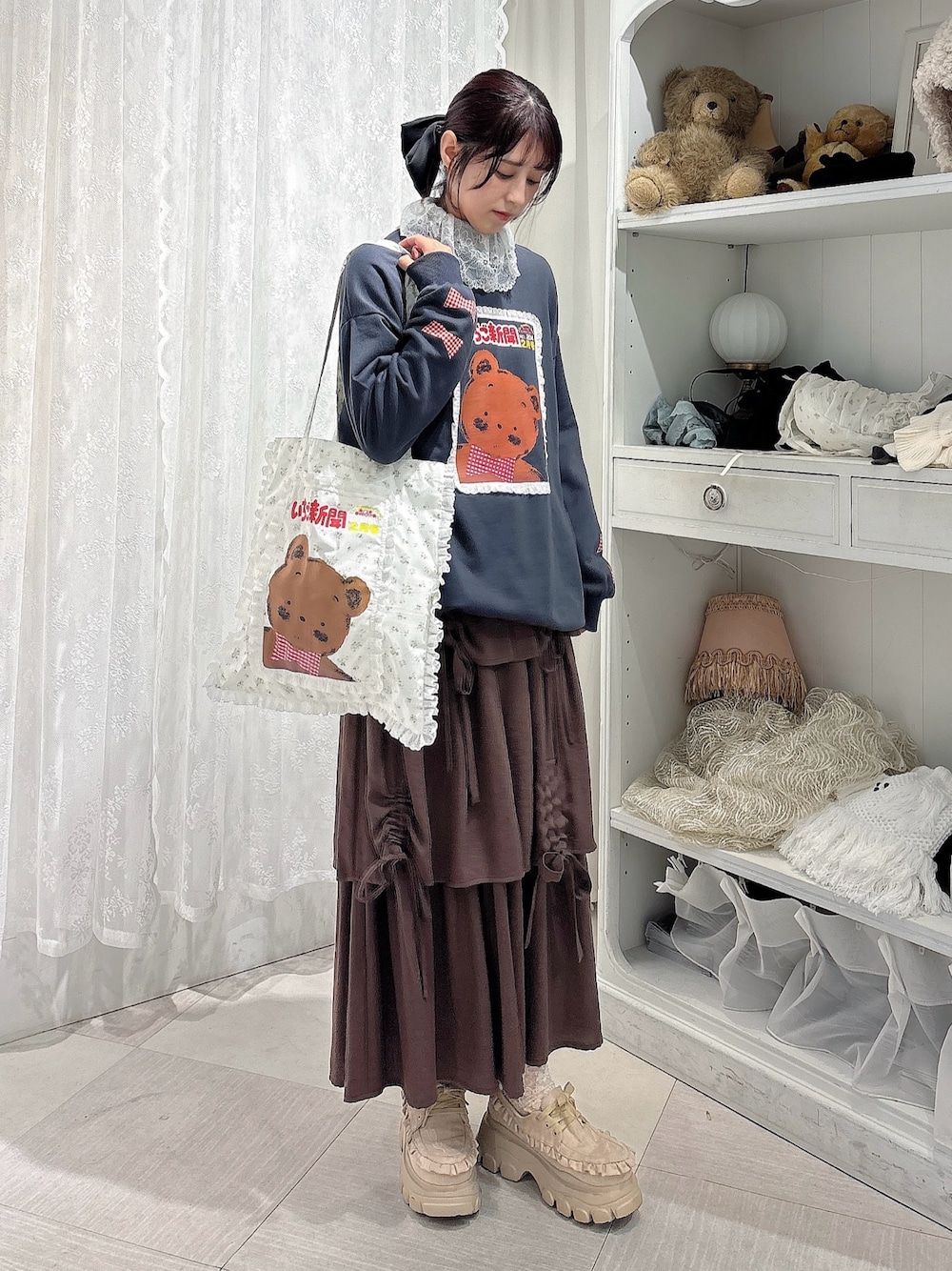 【トップス】 毎年人気のレースリブニットはやわらかくて着心地もよく、レイヤードコーデを華やかにしてくれる一枚。 【トップス】 いちご新聞のコラボスウェット。サンリオのファンにはたまらないアイテム。オーバーサイズがヴィンテージライクで、レイヤードコーデにもおすすめ◎ 【スカート】 単色で合わせやすいですが、ティアードやドロストのデザインでおしゃれ感◎ウエストゴムなのもありがたいポイント。 【シューズ】 秋らしいスエード生地を使用したローファーは、厚底でスタイルアップ効果◎レースアップでスニーカーライクなデザインなので、カジュアルなコーデにも相性◎ 【バッグ】 いちご新聞のコラボトートバッグ。大容量で普段使いにもおすすめ◎