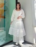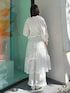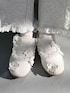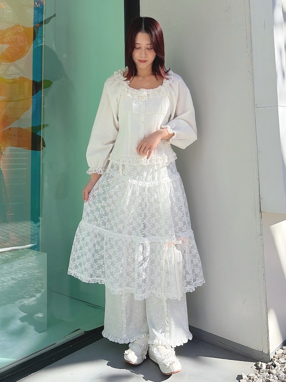 【トップス】 スクエアネックが大人っぽく、フリルとふんわりした袖のシルエットでガーリーさも演出してくれるブラウス。メリハリのあるシルエットなので着膨れしにくいです。 【パンツ】 ワイドシルエットでラフに着られるスウェットパンツ。裾とラインにフリル付きなのでラフすぎず、トレンド感も◎ 【スカート】 アシンメトリーについたリボンがポイントのレイヤードスカート。ワンピースやボトムにあわせて華やかに◎ 【シューズ】 フラットシューズでラフに履けるのにお花と繊細なレースが唯一無二なアイテム。様々な系統に相性◎