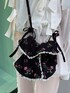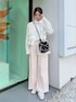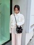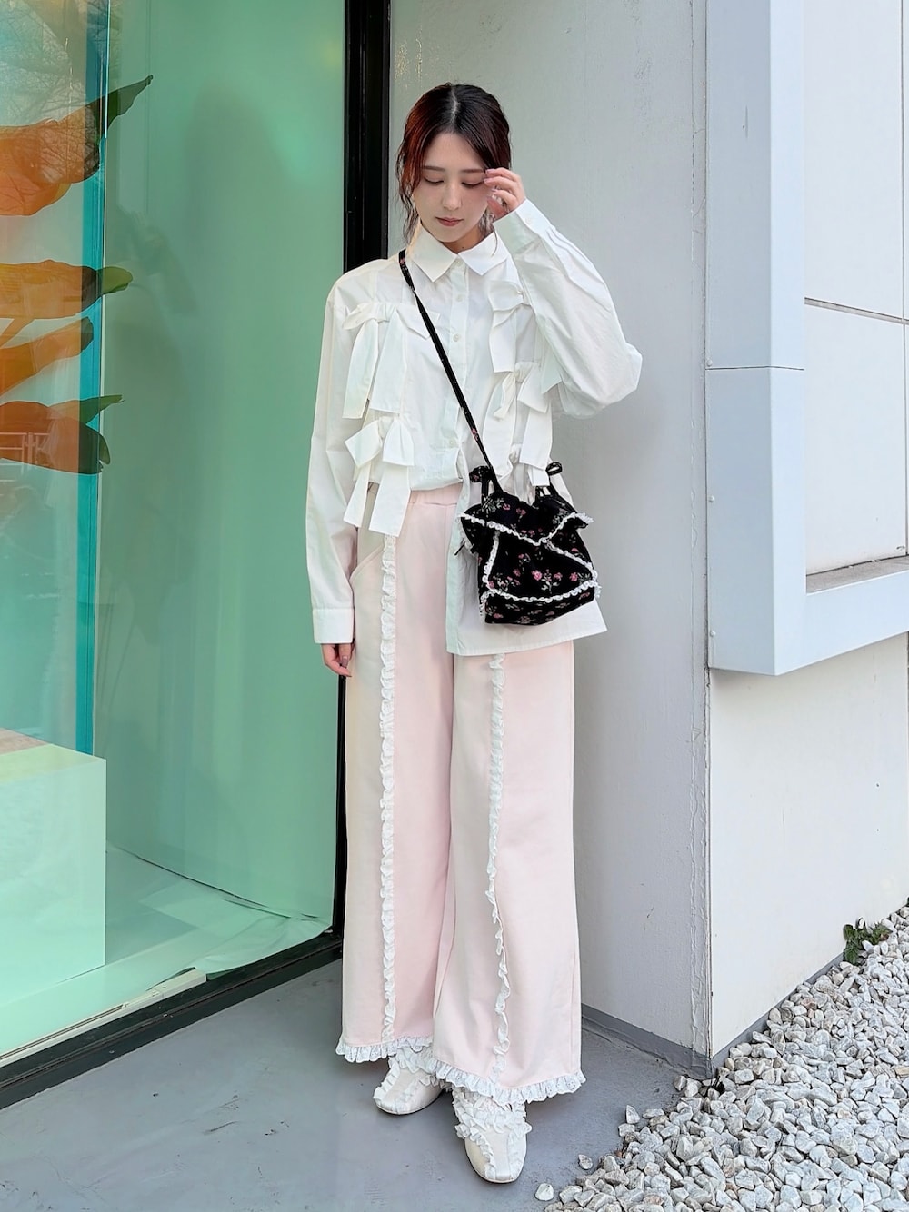【トップス】 大きめのリボンがポイントのシャツは、オーバーサイズでゆるっと着られるのでカジュアルさも◎ 【パンツ】 ワイドシルエットでラフに着られるスウェットパンツ。裾とラインにフリル付きなのでラフすぎず、トレンド感も◎ 【シューズ】 トレンド感のあるバレエシューズ。フリルたっぷりで気分が上がる一足! 【バッグ】 甘すぎない花柄でさまざまなテイストに相性◎なポシェット。底のマチもしっかりあるので使いやすさも◎