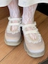 【トップス】 襟がスカラップになっていて顔周りを華やかにしてくれるブラウス。袖口も襟と同じスカラップなので、抜かりなくおしゃれ感◎ 【ワンピース】 白地に水色の柄がふわっとガーリーなキャミワンピース。インナーには様々なアイテムを合わせやすく、着回し力も高いです! 【チャーム】 ふわふわで手のひらサイズのかわいらしいチャーム。同じコラボのポシェットの中で眠らせてあげてください(^^) 【バッグ】 オーガンジーとお花でmerry jennyらしさもありつつ、中のふわふわの部分に別売りのチャームマスコットを寝かせられます◎ 【シューズ】 歩きやすい厚底スニーカーですが、サテン生地とレースでラフ見えしすぎない一足!