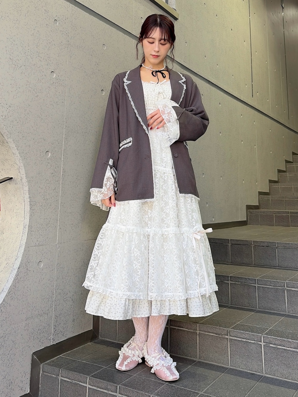 nanaka(merry jenny)のテーラードジャケット「lace slit ribbon jacket」を使ったコーディネート