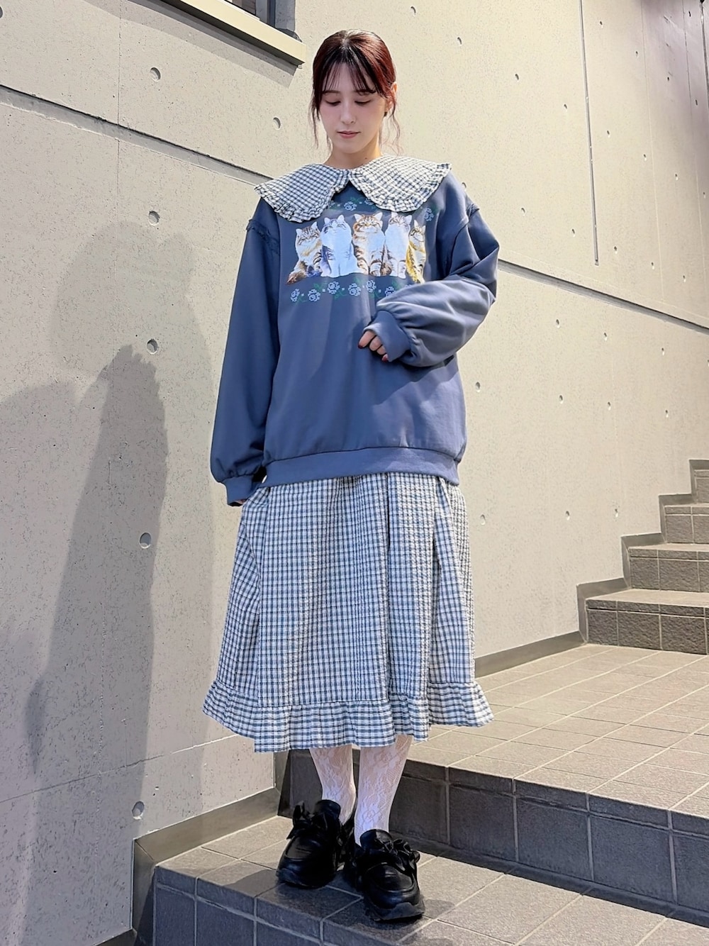 【ワンピース】 かわいくて合わせやすいチェックワンピースは、一枚持っておくとアレンジなども楽しめて着回し力抜群です! 【トップス】 ダメージ加工でヴィンテージライクですがお花と猫でかわいらしい印象に。ゆったりとしたサイズ感で着心地も◎ 【シューズ】 スニーカーとローファーのいいとこどりなシューズ。軽くて歩きやすく、大きめのリボンがアクセントに!