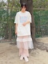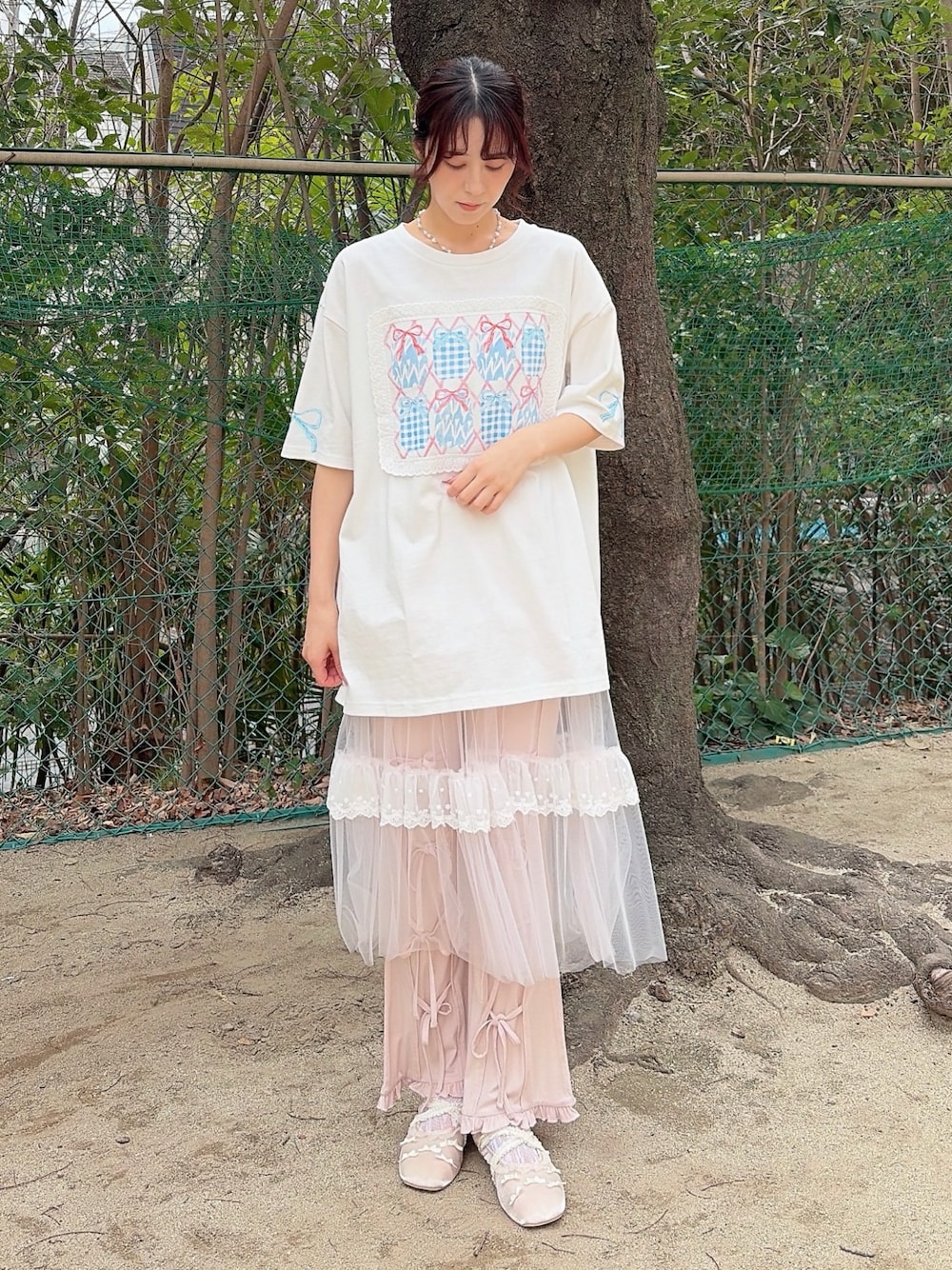 【トップス】 かわいらしいプリントとオーバーサイズのバランスが絶妙なTシャツ。着方次第でガーリーにもカジュアルにも着こなせます! 【スカート】 いつものコーデにプラスするだけで華やかに!ふわっとしたチュールがガーリーコーデに相性◎ 【パンツ】 縦に並んだリボンがスタイルアップ効果◎なパンツ。裾のシルエットも綺麗なのでレイヤードにもおすすめ! 【シューズ】 春夏らしいシアーのバレエシューズ。小さいリボンがたくさんついていて、足元までガーリーさ◎