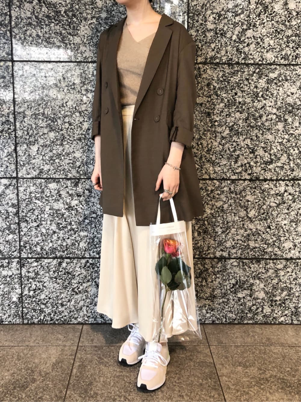 サテンのスカートをロング丈のテーラードジャケットとスニーカー合わせでカジュアルにしてみました ! このジャケットは素材感も薄めになっているので、春や秋には長袖と合わせたり、夏にはキャミソールと合わせてロングシーズン使えます ! ジャケットを羽織ることででデニム合わせもこなれ感が出るので1枚あって間違いありません ◎ ◎ アシンメトリーのニットは柔らかく着心地も抜群ですよ!シンプルなパンツ合わせでもカジュアルになりすぎず着ていただけます!