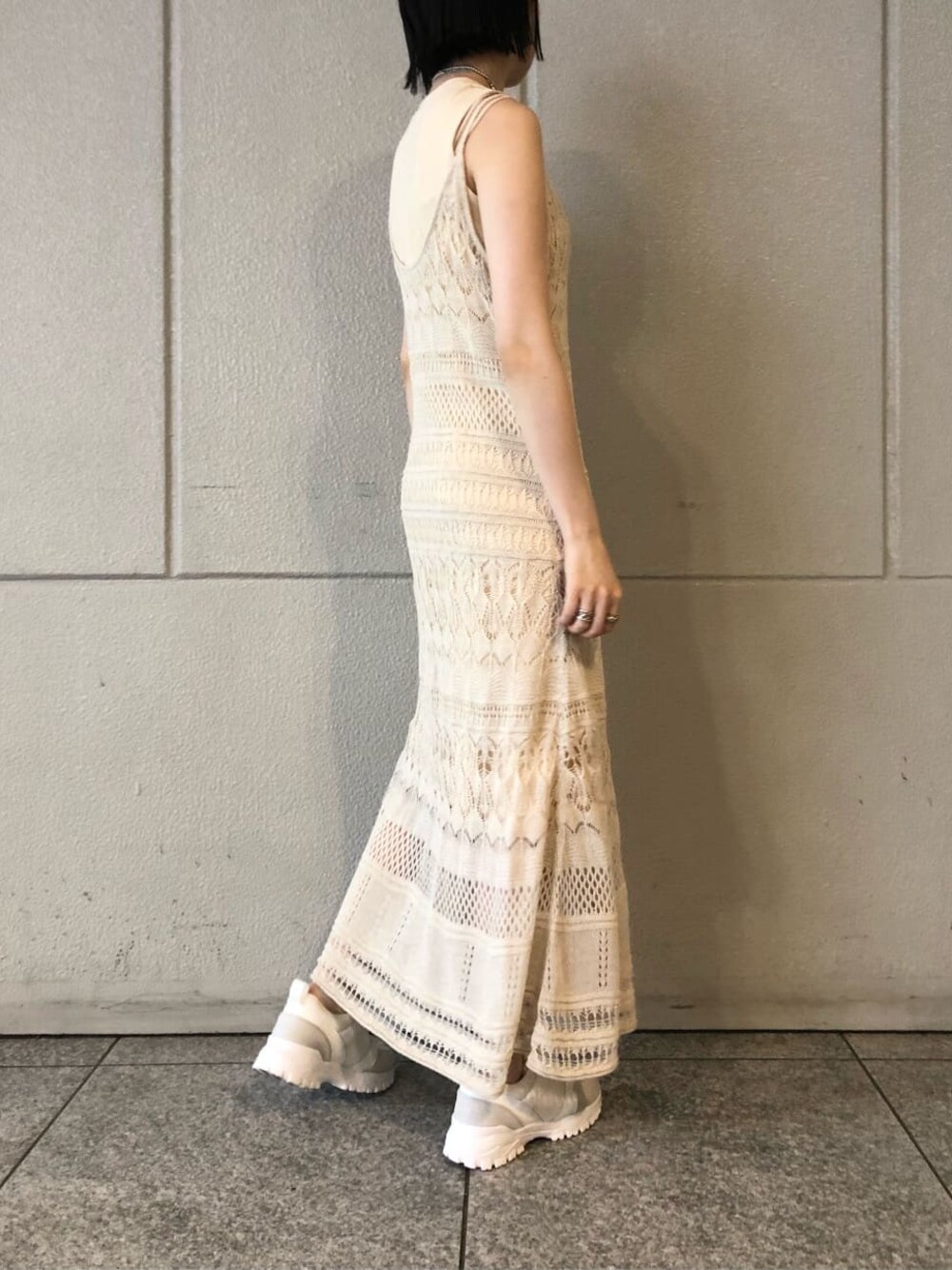 夏らしい涼し気な印象の透かし編みのニットワンピース。 今年らしくスニーカーで合わせてみました! 膝丈のカット素材ワンピースとキャミワンピースのセットなので別々でも、レイヤードスタイルでもコーディネートを楽しんでいただけます! インナーを変えてデニムとカジュアルに着ていただくのもオススメ! 程よいAラインでくびれのある女性らしいシルエットで着ていただけるのも魅力 ◯